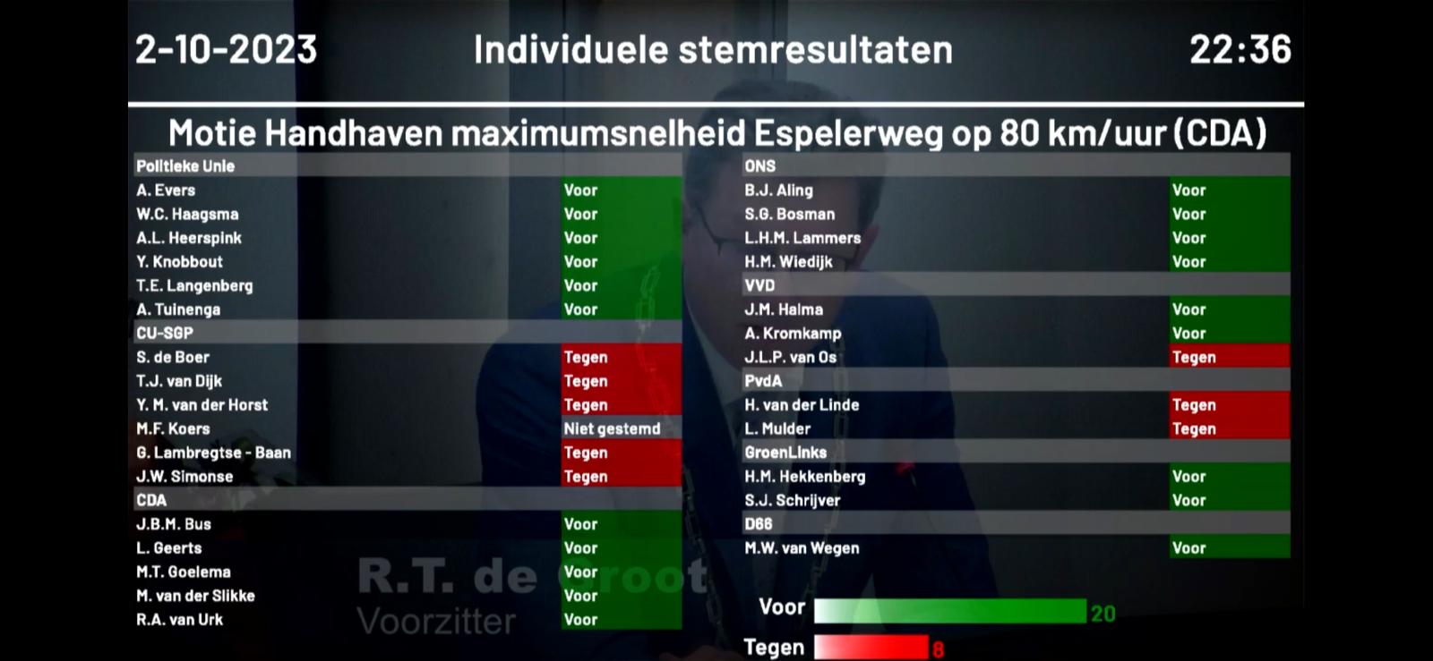 Motie van ONS / CDA aangenomen inzake continuering 80 km snelheid op Espelerweg